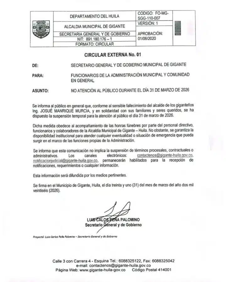 En señal de respeto por el fallecimiento del alcalde, la Administración Municipal de Gigante decidió suspender la atención al público durante la jornada del martes. Esta medida, comunicada a través de la Circular Externa No. 01, busca permitir que directivos, funcionarios y colaboradores participen en las honras fúnebres del mandatario.