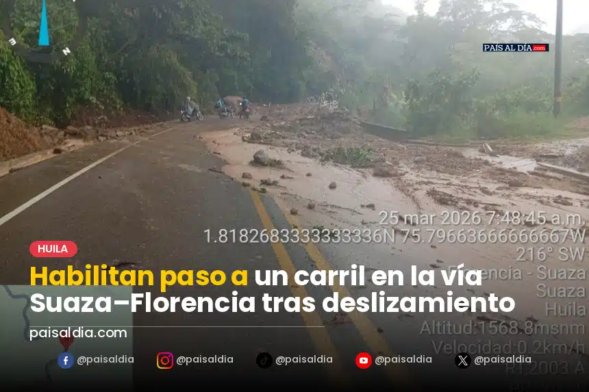 Un deslizamiento de roca, lodo y piedras ha mantenido el paso restringido a un carril en la vía Suaza–Florencia, en el Huila. Esta emergencia se registró en la madrugada del 25 de marzo de 2026 debido a las intensas lluvias.